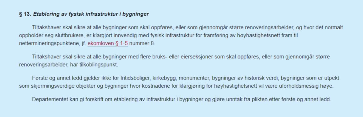 « Vi opplever ulik praksis på bestilling, prosjektering og utførelse av fysisk infrastruktur – altså passive føringsveier for fremtidig høyhastighetsnett. En del ekominstallatører frykter å bli stående med ansvaret om det ikke blir etablert tilstrekkelig føringsveier. Dette er bakgrunnen for at vi har utviklet disse dokumentene, og vi anbefaler å ha tydelig avklaring på hva som leveres. »